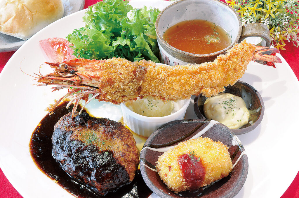 4月のスペシャルランチもご好評いただいております大エビフライとハンバーグがメインのワンプレートランチです。