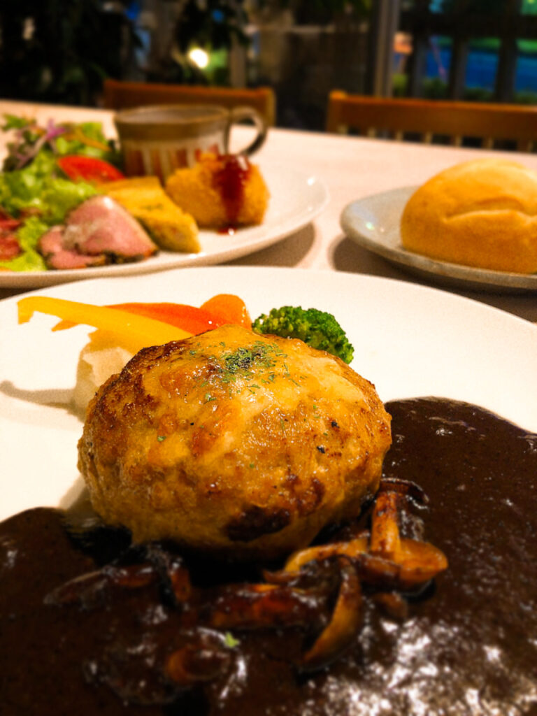手ごねハンバーグにチーズをのせてオーブンでじっくり焼き上げました。